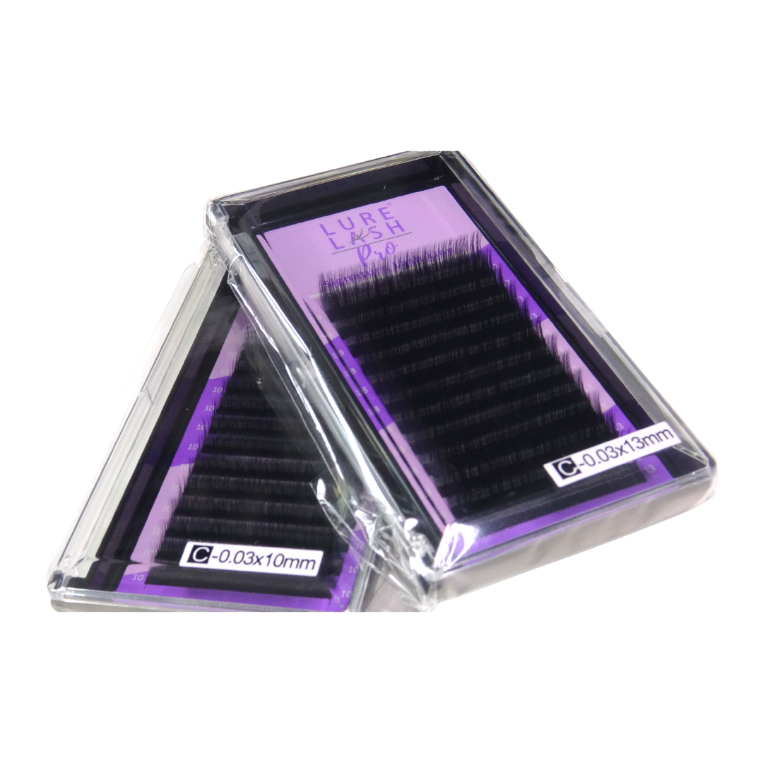 Lure Lash Pro Volume collection. C Curl .03 is the softest curl. The .03 collection can help you create thick velvety fans. The most versatile curl goes great on almost every eye shape! Creating volume fans by hand is the ultimate way to achieve that rich and dark look your clients love!