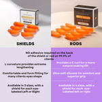 The physical silicone product is softer, more moldable and more FLEXible – hence the name. This supple silicone is ultra-soft, comfortable and form-fitting for so many clients eye shapes. They truly assist with the shield placement during the lifting service and similar to our flex rods the new silicone nature means there is no need to use adhesive on the back of the shield to hold the apparatus in place (from all of our tests, we dare not say EVER because there may be an eye shape we haven’t lifted before, but if you watch our Instagram reel we discussed some interesting statistics on this – here is the link for you to watch and share https://www.instagram.com/reel/CmXck0ZB8IE/?igshid=YmMyMTA2M2Y=).